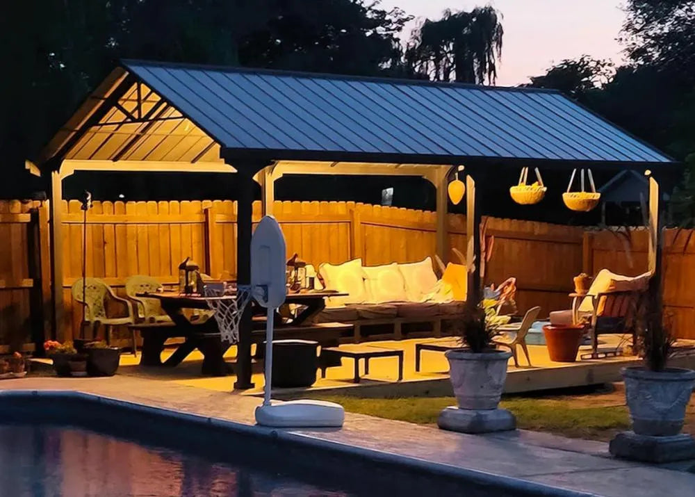 Metal gazebos and pergolas find warmth through lighting and fabric.