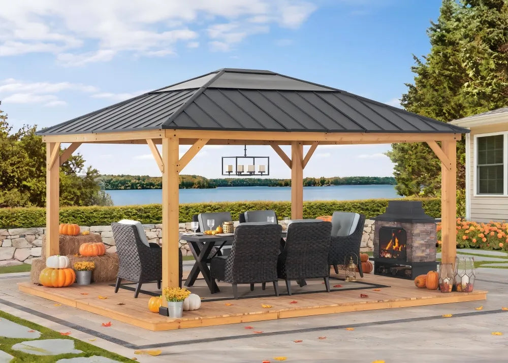 A wood gazebo already carries warmth in its very structure — rich grains, earthy undertones, and a texture that glows under soft light. During fall and Thanksgiving, this natural foundation becomes the perfect base for warm décor.