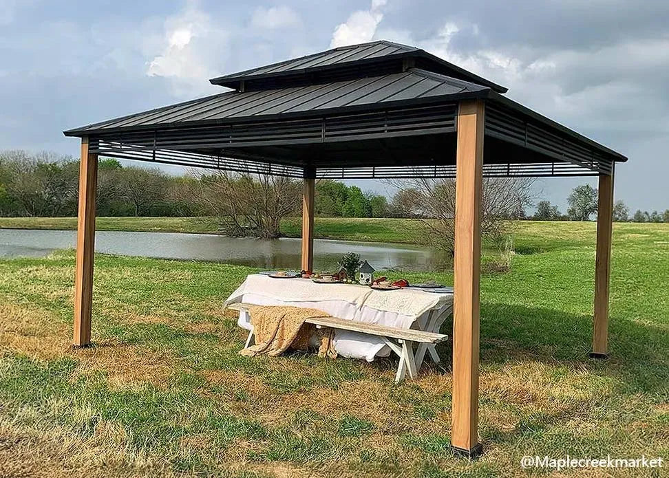 While wood brings organic charm, metal gazebos create a modern counterpoint. Their clean lines and cool surfaces might seem less “warm” at first glance, but that’s exactly why they thrive in fall design — contrast creates balance.