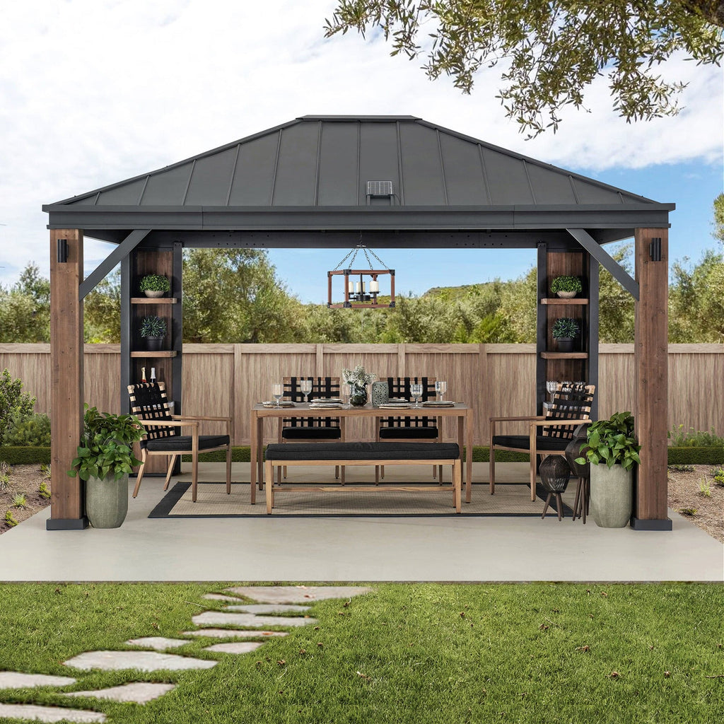 Agrandissez votre espace de vie en transformant l'intérieur en extérieur pour créer une oasis de fin de journée, idéale pour recevoir famille et amis. Ce gazebo de 28 x 33 cm, conçu par SUNJOY, leader mondial des structures extérieures prêtes à monter, crée un cadre extérieur idéal. Profitez d'un espace extérieur abrité sous le toit et la structure en acier thermolaqué, ainsi que des éléments de structure en cèdre naturel. Un éclairage LED pratique alimenté par batterie est intégré au gazebo. De plus, profitez de votre musique préférée grâce à la fonction Bluetooth, alimentée par les batteries rechargeables fournies, rechargées via le panneau solaire intégré de 5 V et 6 W. Créez l'ambiance en suspendant un lustre au crochet de plafond intégré pour un éclairage fonctionnel et un design élégant. Grâce aux instructions de montage simples et faciles à suivre, vous pourrez vous détendre avec votre boisson préférée dans votre nouvel espace de vie extérieur préféré pendant des années.