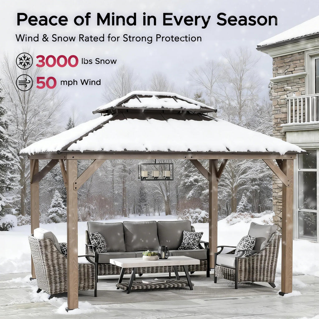 Expand your living space by bringing the indoors outside and create an end-of-the-day oasis that’s an ideal spot for entertaining family and friends. This 10 ft. x 12 ft. wood gazebo from the world’s leading ready-to-assemble outdoor structure maker, Sunjoy, creates the perfect outdoor setting for a gathering any time of the year. Spend all four seasons enjoying your covered area outdoors under a cedar wood frame gazebo with a sturdy powder-coated steel roof top that will stand the test of time. The 2-tier roof provides just the right amount of airflow while simultaneously keeping occasional inclement weather at bay. Set the mood by suspending a chandelier from the incorporated ceiling hook for functional light and a touch of elegant design. With straight-forward, easy-to-follow assembly instructions you’ll soon be relaxing in your favorite new outdoor living space, and for years to come.