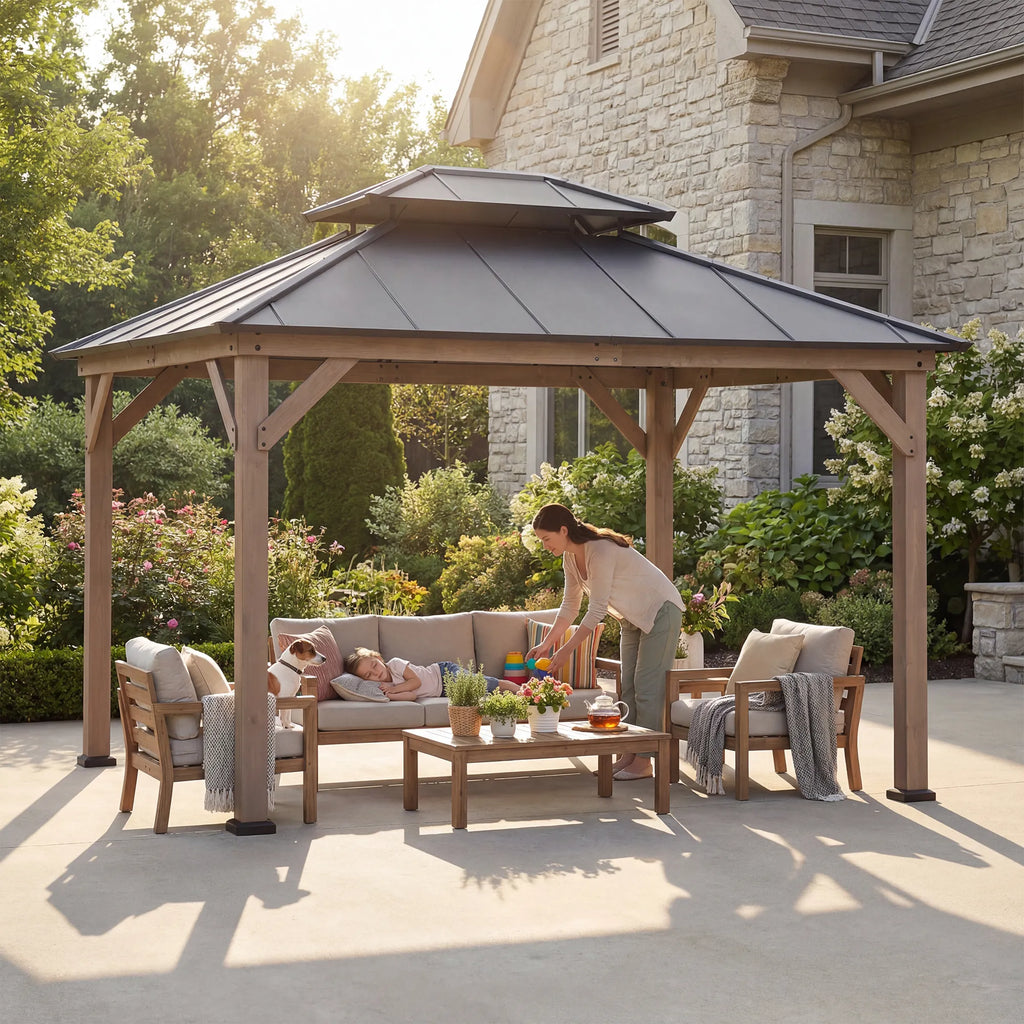 Expand your living space by bringing the indoors outside and create an end-of-the-day oasis that’s an ideal spot for entertaining family and friends. This 10 ft. x 12 ft. wood gazebo from the world’s leading ready-to-assemble outdoor structure maker, Sunjoy, creates the perfect outdoor setting for a gathering any time of the year. Spend all four seasons enjoying your covered area outdoors under a cedar wood frame gazebo with a sturdy powder-coated steel roof top that will stand the test of time. The 2-tier roof provides just the right amount of airflow while simultaneously keeping occasional inclement weather at bay. Set the mood by suspending a chandelier from the incorporated ceiling hook for functional light and a touch of elegant design. With straight-forward, easy-to-follow assembly instructions you’ll soon be relaxing in your favorite new outdoor living space, and for years to come.