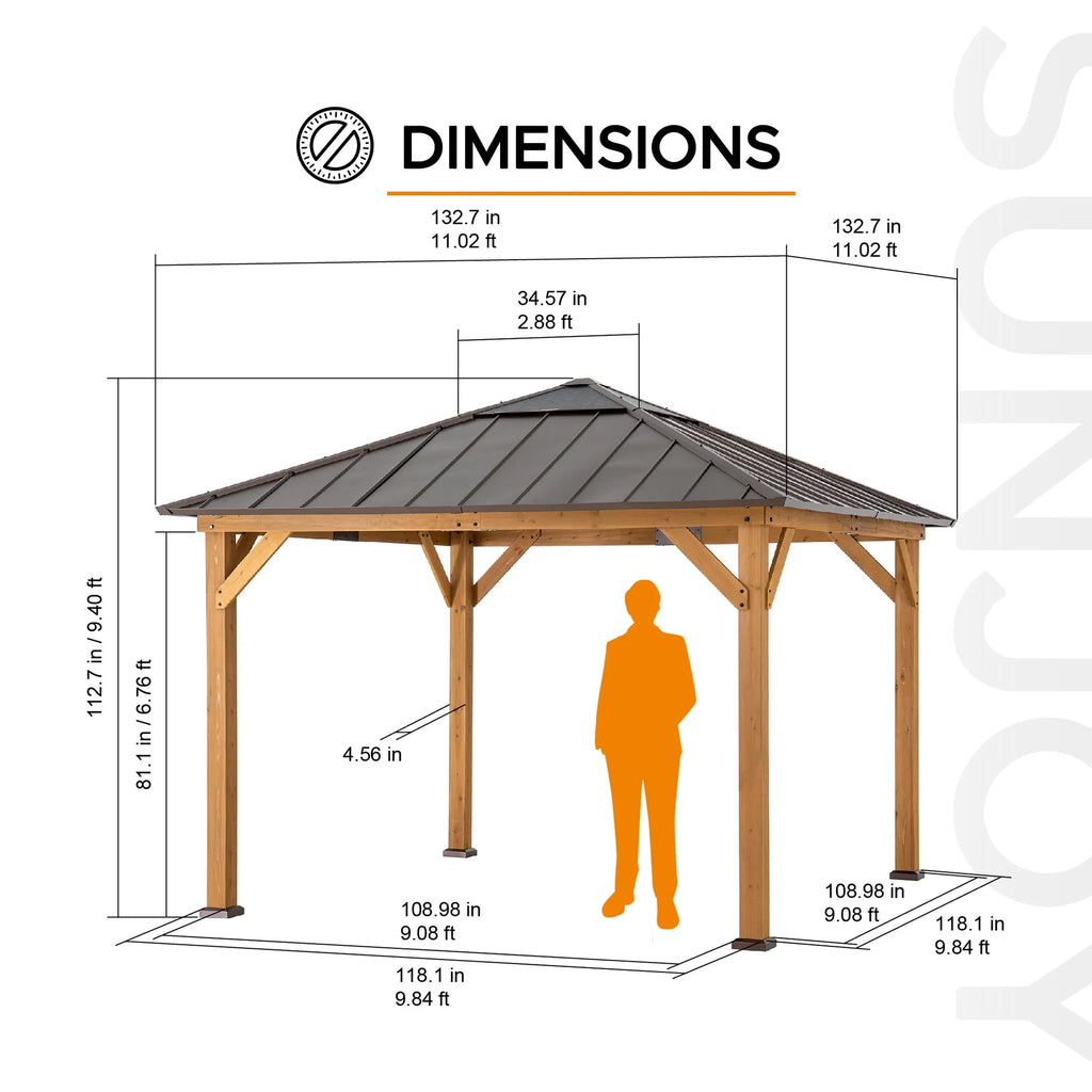 Expand your living space by bringing the indoors outside and creating your end-of-the-day oasis that’s the perfect spot for entertaining family and friends. This 11x11 ft. hard top gazebo by the world’s leading ready-to-assemble outdoor structure maker, SUNJOY, creates the perfect outdoor setting for any time of the year. Spend all four seasons enjoying a covered spot outdoors beneath a cedar wood frame and sturdy powder-coated steel and polycarbonate roof top that will stand the test of time. The frosted polycarbonate skylight allows the gazebo to provide needed shade on hot sunny days while still allowing in natural light. Set the mood by suspending a chandelier from the incorporated ceiling hook for additional functional light and a touch of elegance. With straight-forward, easy-to-follow assembly instructions you’ll soon be enjoying your favorite new outdoor living space, and for years to come.