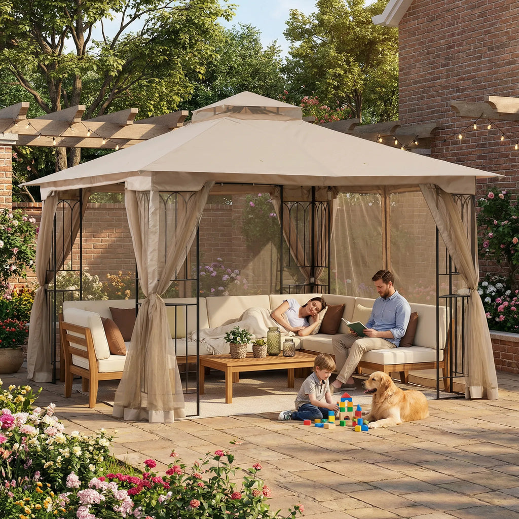 Enjoy a stylish, functional outdoor retreat with the SUNJOY 11x11 Soft Top Gazebo. Its dual-tier khaki canopy promotes airflow, and the upper vent is lined with fine mesh to keep bugs out while letting warm air escape. The powder-coated steel frame delivers strength and seasonal durability with a sleek brown finish that fits any backyard style.