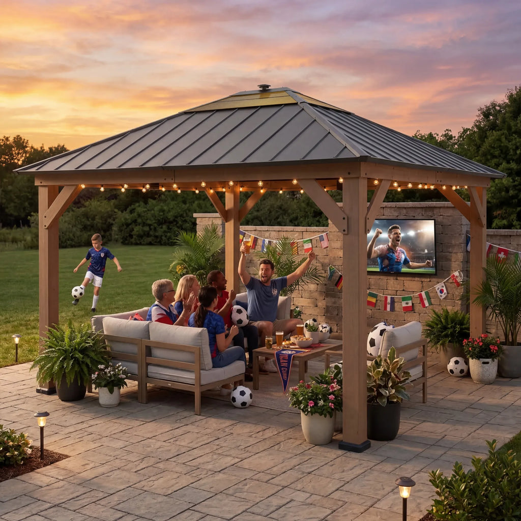 Expand your living space by bringing the indoors outside and creating your end-of-the-day oasis that's the perfect spot for entertaining family and friends. Spend all four seasons enjoying a covered spot outdoors under the cedar wood frame with a sturdy powder-coated steel and polycarbonate rooftop that will stand the test of time. The 3.7V 9.25W solar panel on the top can power up the built-in LED lights. Set the mood by suspending a chandelier from the incorporated ceiling hook for additional functional light and high design. With straightforward, easy-to-follow assembly instructions you¡¯ll be relaxing with your beverage of choice in your favorite new outdoor living space for years to come.