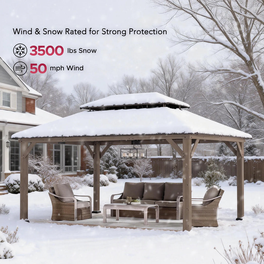 Expand your living space by bringing the indoors outside and create an end-of-the-day oasis that’s an ideal spot for entertaining family and friends. This 12 ft. x 16 ft. wood gazebo from the world’s leading ready-to-assemble outdoor structure maker, SUNJOY, creates the perfect outdoor setting for a gathering any time of the year. Spend all four seasons enjoying your covered area outdoors under a cedar wood frame gazebo with a sturdy powder-coated steel rooftop that will stand the test of time. The 2-tier roof provides just the right amount of airflow while simultaneously keeping occasional inclement weather at bay. Set the mood by suspending a chandelier from the incorporated ceiling hook for functional light and a touch of elegant design. With straightforward, easy-to-follow assembly instructions you’ll soon be relaxing in your favorite new outdoor living space, and for years to come.
