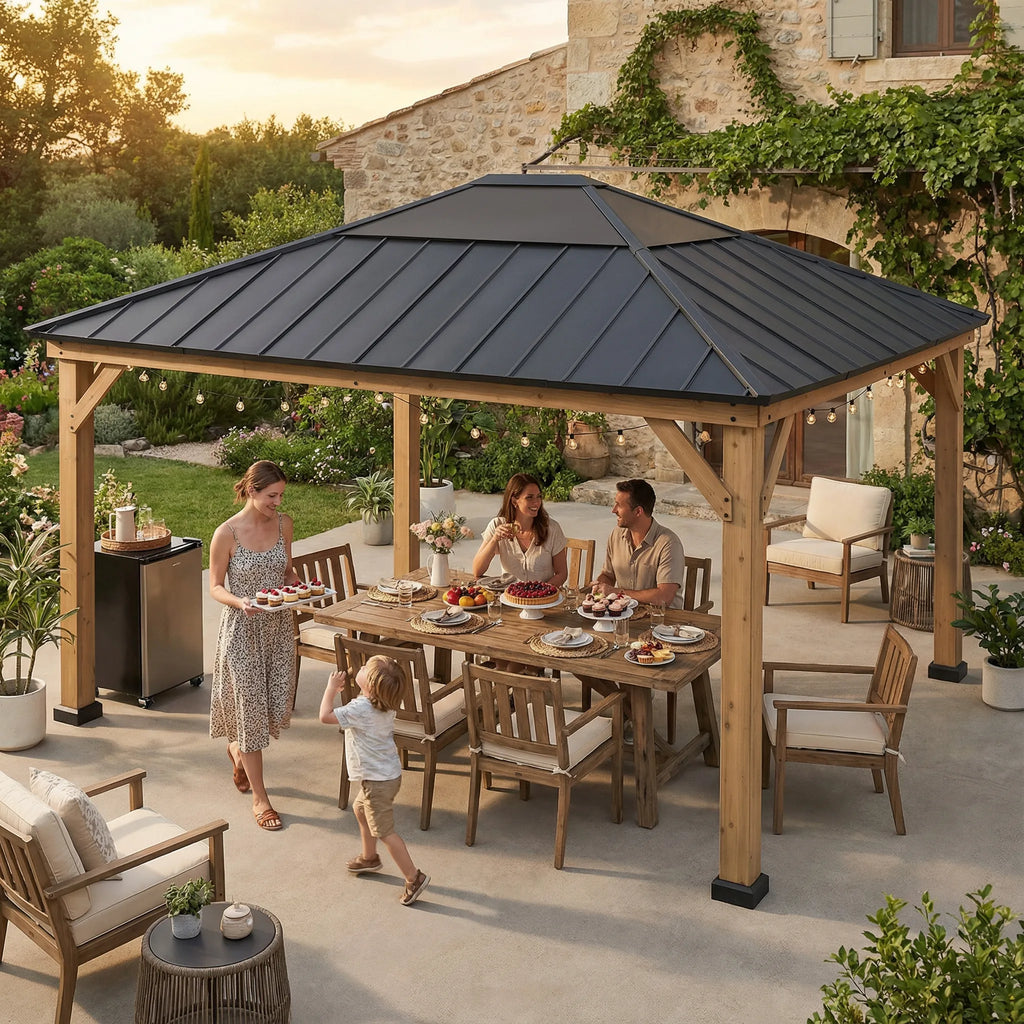 - Durable Matte-Black Steel Roof: Rest easy under this durable matte-black steel roof that will withstand the elements for seasons to come. Sun, rain, or snow, you and your patio furnishings will be protected beneath this hardtop gazebo.