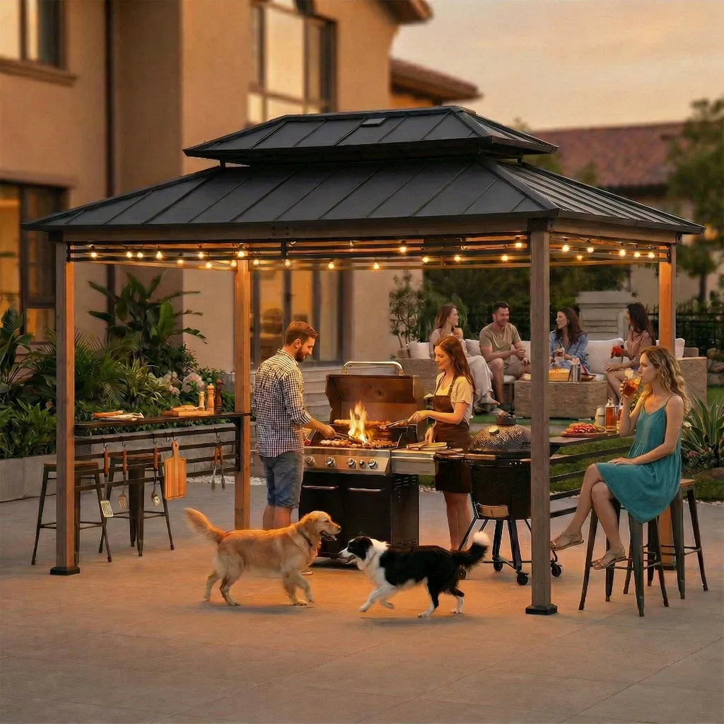 Introducing the ultimate backyard oasis - the 8 ft. x 12 ft. Aspen cedar framed hardtop grill gazebo from SUNJOY. Elevate your outdoor gatherings with this backyard chefβs haven, shielding you from the scorching sun while creating the perfect ambiance for grilling and quality time with loved ones. Crafted with premium cedar wood and protected by a durable finish, this gazebo is built to last. The sleek brown powder-coated steel roof adds both style and resilience. Stay organized with built-in shelves, perfect for organizing your grilling essentials and cutlery. Streamline your grilling experience and take it to the next level with hooks for conveniently storing your grill tools. And that's not all - with our cutting-edge integrated 5V 6W solar panel, you can charge your devices effortlessly while you grill. Assemble with ease using the straightforward instructions and in no time, you'll be unwinding in your favorite new outdoor living space. Embrace outdoor grilling, BBQing, and backyard gatherings like never before with this exceptional grill gazebo from the worldβs leading ready-to-assemble outdoor structure manufacturer.